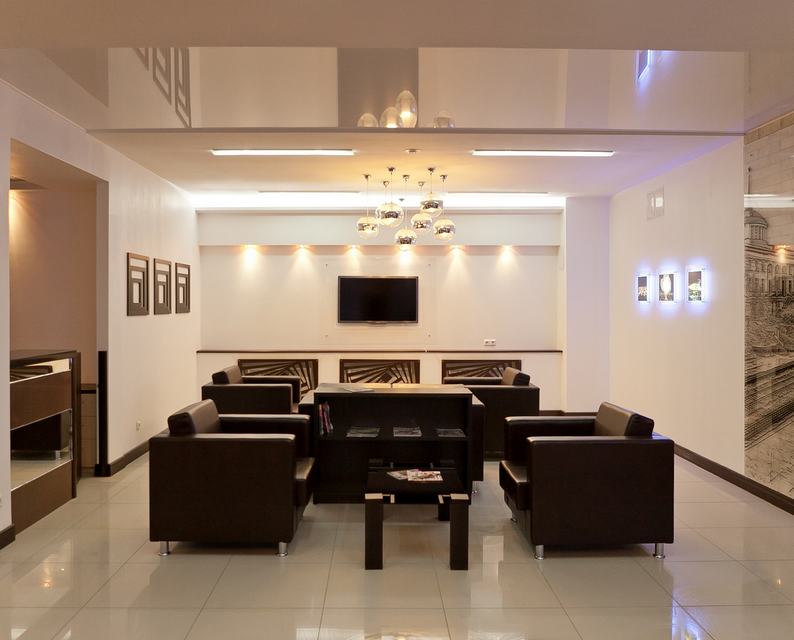 Мы проводим работы по отделке комнат, холла, стойки ресепшн.